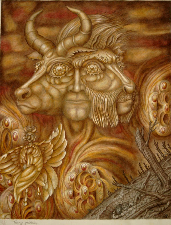 Die Figur des Dreigesichts und des Stiers tauchen auch in einer Reihe anderer Bilder